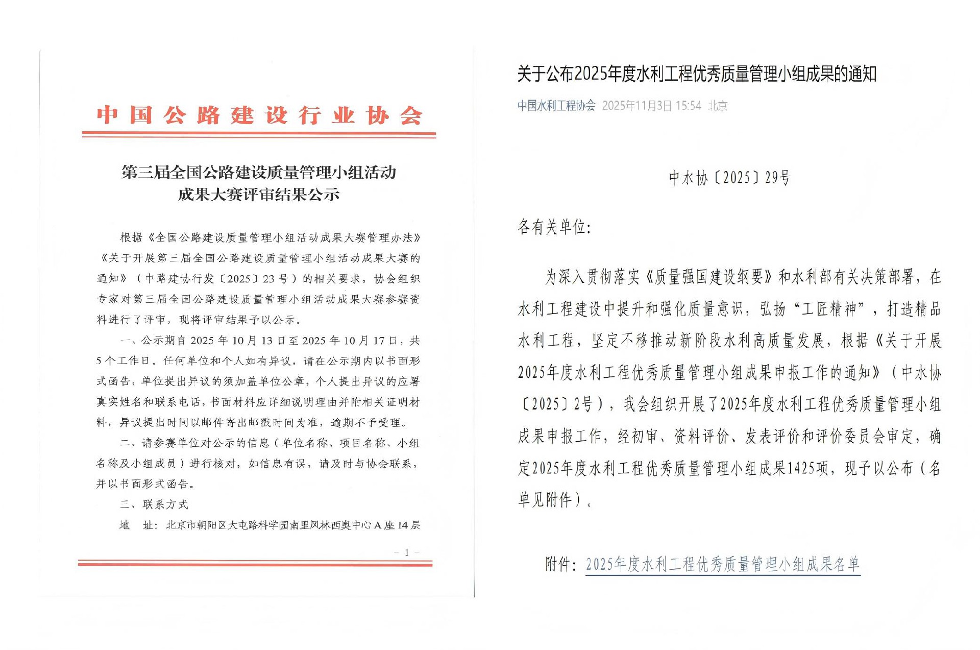 近日,中國公路建設(shè)行業(yè)協(xié)會、中國水利工程協(xié)會先后公布了第三屆全國公路建設(shè)質(zhì)量管理小組活動(dòng)成果評審結(jié)果和2025年度水利企業(yè)質(zhì)量管理小組競賽活動(dòng)結(jié)果。“···